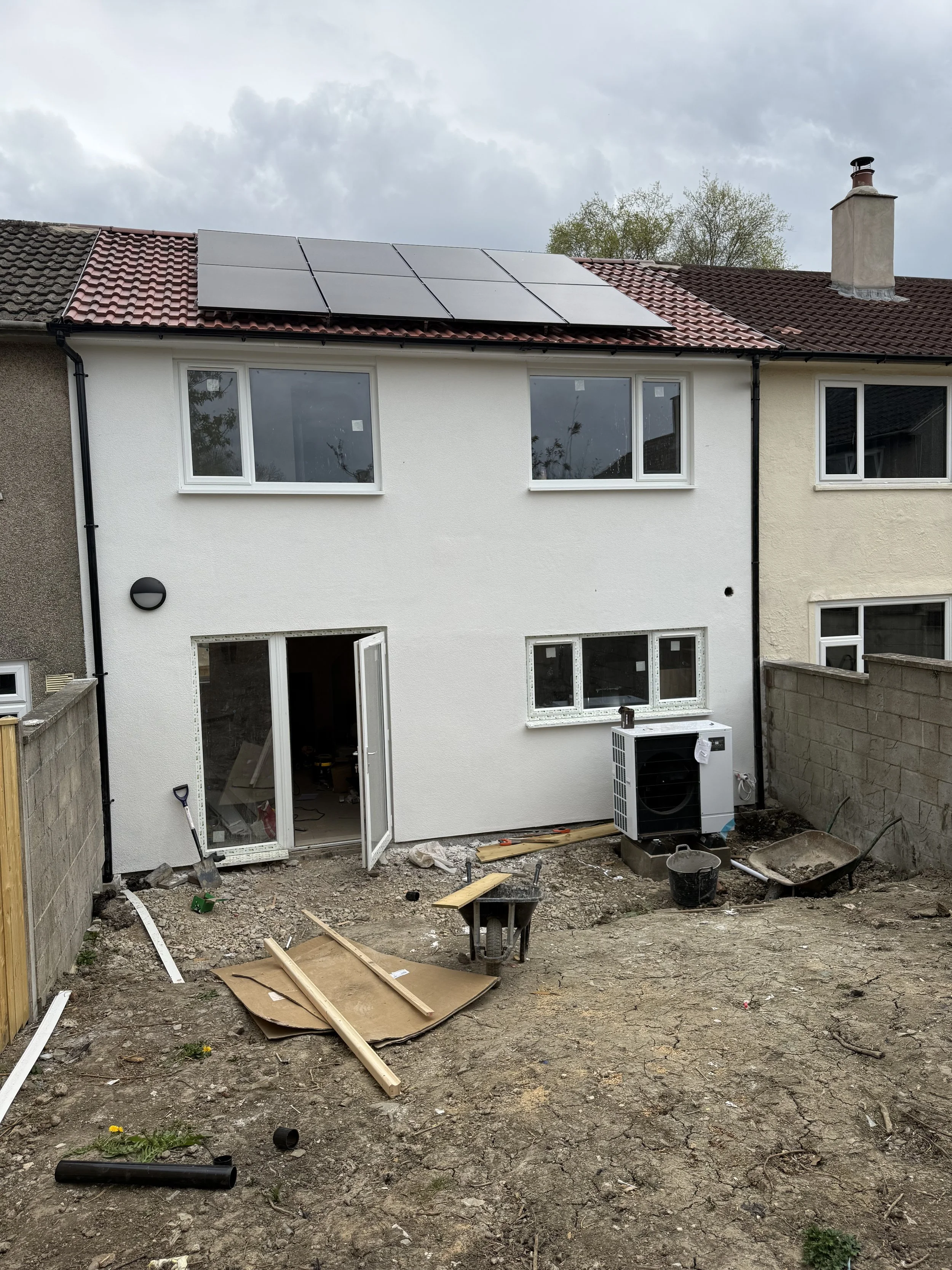 A new system for energy generation was installed. An air source heat pump was installed at the rear and eight solar panels placed on the roof. Both now feed into battery storage located in a small ‘plant room’ next to the hot water storage tank. The ‘plant room’ is actually a small existing cupboard that would originally have been the coal store.